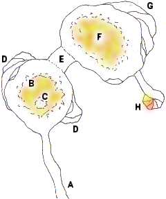The deeper anyone goes into the tunnel, the more sulphur they find -- and the more difficult it becomes to breathe. The nasty gases of the deep prevent humanoids that breath from performing at their best: at the source of the magma, any characters down there would suffer a cumulative penalty. Just getting to the source of the magma engenders ever-increasing penalties, as well. d20: Cumulative -4 penalty to their Constitution, for every hour spent in the caverns. Within the tunnel itself, the penalty is -1 to Constitution after 1000 feet, and climbs every 500 feet thereafter (tunnel length is roughly 2,500 feet). The dragon carved out the tunnel with its claws and horns, and its marks are all through the tunnel entrance and the caverns. The first pool of magma (B) gives off a warm red glow and is burning hot at 700F. A small island (C) near the entrance has an iron rod driven into it. The island has what appears to be the princess, bonded by an iron collar and a thick leather strap to the steel pole. The women the dragon takes are chosen obstensibly for their virginity -- but actually for their appearance. All of the women taken resemble the princess, but no one has cued in on this. A skill check might reveal this, if anyone's interested in what the women looked like. The women rarely last more than a week in the intense heat -- and wouldn't last more than a few days without water. A large, lidded rock cistern serves as a source of water for the maiden chained the iron spike, with the golems delivering water now and again within their huge, cupped hands. The source of the water is unknown, but large dragon-marks on the sides indicate that the dragon might replenish the cistern now and again by carrying it to the surface. The iron collar around the maiden protects the wearer from the sulfurous gases given off by the magma, and acts as a protection from poisonous gases item. If the collars are forced off or broken, they ignite in a combustion that literally takes the head off of whomever wears them. The maiden chained to the iron pole is likely unconscious, but if revived and taken care of, may release her name, after careful coaxing, as Jessica. She was taken from the nearby village of Therthorpe, and is not the princess Alicarnya. The dragon often knocks her unconscious, somehow, whenever she sees him, so she knows little of what he does. The magma chamber has two large areas the dragon carved out with steps and ledges (D). The northern area drips with golden coins, jewels, silver, and more -- but the treasure is only coin-deep. D Treasure: 2,315gp, 4,709sp, 12,678cp, 520 gems of random type and none worth more than 10gp. The southern ledges have an iron golem that deals with the usual trespassers, and also keeps the maidens alive as long as possible. After they die, the dragon would bring another maiden for the golem to tend. There is no iron ore in the cavern -- the golem picks it up and moves it. Histovix keeps one wall of the cavern illusory, and mounted on an eight-foot ledge (E), out of reach of most humans. The illusion helps hide any scarring of the walls Histovix' passings would leave. Difficult search-by-feel checks reveals the presence of an illusion, though not where. The tunnel (E) leads to another cavern with another eight-foot ledge. Inside that cavern is another pit of magma (F) wherein the dragon usually resides, rests, and works. The real princess is kept bolted to the wall with an iron ring inset and a strip of leather. Next to the princess are the rotting remains of all the other maidens the dragon kidnapped over time. The princess has plenty of water -- another lidded rock cistern with scum-covered slime in it. Her only food was the corpses of the other maidens. The princess Alicarnya is half mad from starvation, torture, heat, dehydration, and dealings with the mad ramblings of the dragon. The princess bears one of the iron collars that protects her. The bodies of each maiden bears the collar, as well. Worse, the princess has been fooled by illusions into thinking that she has eaten her own child in her desperate hunger. Much mental healing will need to be done to heal her, and only someone who notices her stretch marks on her starving, skeletal form, will realize she has had a child. Tonnes of raw iron ore are scattered about the cavern, and some of the walls bear signs of intense heating and even glassification. Histovix is a dragon that has figured out how to make his own golems. The heat of the magma is only enough to keep him warm and kill would-be intruders, but his breath weapon is hot enough to smelt iron. Two more iron golems remain in the back cavern, with four more in the midst of construction on the southern shelf. Histovix :An enormous, ancient red dragon with a chip on his shoulder. He hates the Inquisition, he hates humans, he hates elves, he hates dwarves -- he hates everyone and everything. Unlike most historical dragons, he has no love of gold or silvers or treasures, and he has a formidable intelligence. A practitioner of the darker arts, he has studied and continues to study the arcane with a feverish intensity -- and it is his one weakness. None may establish a dialog with the spiteful, hateful dragon until they can match his ferocious knowledge of magic. The dragon's escape route (H) is a set of dragon-sized stairs that go deeper into the magma.