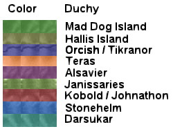 T Darsukar Duchy - Duchess (Princess) Genea Anahliest U Alsavier Duchy - Duke Itaeleran Hireyesiye V Eltaraalaalest County - Count Sharkor Dierayalist W Town of Boulderdash - Thane Gadden X Town of Takanal - Baron Cardovar Thespulae Barony of Daggoneth - Baron Trorgil Deepsmith Y Spider Werks / Blatton Islands - Master Jandor Firelight Z City of Chasadan Janis Plains Duchy - Duke Talon Bhramord AA AB AC Kobold / Johnathon Duchy - Duke Mrek Betheld'aa City of Bardran (formerly Itzak'Bardran) - Baron Mherl AD AE AF AG AH AI AJ AK AL AM AN Angel Mountain Barony - Leftenant Grusher Longtooth AO AP AQ AR AS Uncontrolled Territory - Ish'Tir AT Tikranor County - Captain Smathis Orcish / Tikranor Duchy - Duke (Colonel) Canneth Dwarfkiller AU Uncontrolled Territory / Terra Incognita the Dog Men AV Duchy of Mad Dog Island - Duke (ArchMage) Anos